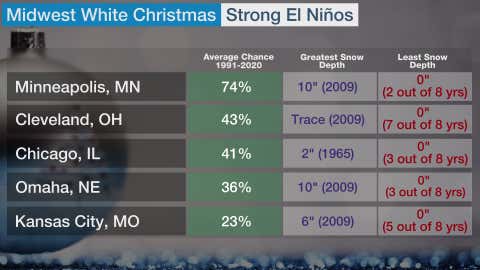 All of the strong El Niño years saw bare land in the Midwest. The absence of a white Christmas is notable in Cleveland and Detroit, where about 40% of Christmases have at least an inch of snow on the ground, but strong El Niño years do not meet the White Christmas criteria. Neither Indianapolis nor St. Louis had a white Christmas in those eight years.