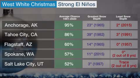 The West is the winner for a white Christmas in strong El Niño years. Western locations that typically enjoy a white Christmas are more likely during a strong El Niño. This is due to the generally more active jet stream across the West during El Nino years.